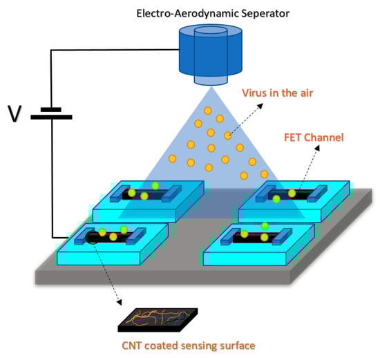 As a back gated structure for SiNW sensors, based on a CMOS fabrication process, a label-free and specific DNA detector were devised in which by applying rolling circle amplification (RCA) on SiNW-FET, they could get higher sensitivity and better performance. Back gated structure was also used for direct detection of airborne viruses without using any solution and wet fluidic section [91]. According to this method, the virus–antibody connected particles are delivered to the FET during detection in which the regular pre-treatment and the antibody binding step on the FET channel are not required. In this method, they have eliminated the washing process for the virus–antibody binding [91]. On top of the sensor area, a layer of CNT was coated, which was used for the detection of virus deposition from the electro-aerodynamics separator (see Figure 17).