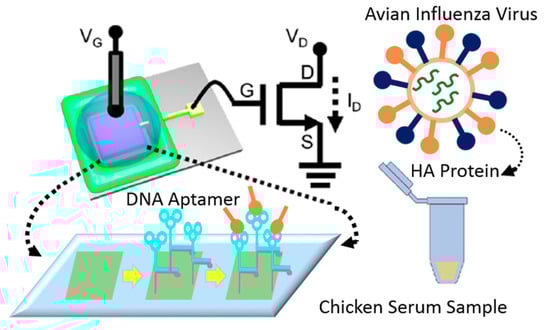 In another study, the integration of a double gate and extended gate was studied to introduce a new sensor structure (see Figure 18). A so-called ‘disposable well gate’ was connected to the top gate of a channel, which was used to detect AIV [92]. This research reports a FET-based AIV sensor that was capable of detecting nucleoproteins within 30 min, down to an LoD of 103 EID50 mL−1 from a live animal swab sample [92].