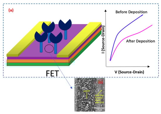 For detection of a sequence of Hepatitis C Virus (HCV) at very low concentrations down to the pM range, a Peptide Nucleic Acid (PNA) CNT-based FET structure sensor was used in which the sensor was working based on the Ag/AgCl solution gate in the electrolyte [87]. The structure of the fabricated sensor is shown in Figure 13, which consisted of metallic SWNTs that would lower the sensitivity of the devices for sensing applications. In this work, to lessen the effect of contact residence between single wall CNTs (SWCNTs) and the metal layer, the contact areas were passivated with microlithograpically patterned Al2O3 (50 nm) or self-assembled dodecanethiol (DDT) monolayers [87].