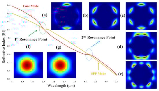 SPP is a specialized term in the metal surface field. An SPP mode is an electromagnetic excitation that exists at the metal surface. Figure 2 shows the resonance points of fundamental modes and SPP modes at 3 m when RI of analyte equals to 1.33. Five SPP modes such as 1st, 2nd, 3rd, 4th, and 5th SPP modes are demonstrated in Figure 2a–e, sequentially. Additionally, two X and Y fundamental modes are displayed in Figure 2f–g.