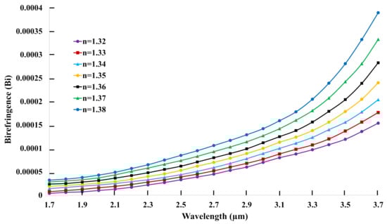 where and are the RI of fundamental mode at X and Y polarizations, respectively. In the whole operation, the wavelength varies from 1.7 to 3.7 m with the increase of RI of analyte from 1.32 to 1.38. The birefringence variation of C-PCF structure with respect to wavelength is illustrated in Figure 3. The RI difference increases gradually with the increase of wavelength which is clearly noticeable in Figure 3. At the same time, there exists another correlation among the analytes, with higher RI of analytes exhibiting a higher birefringence. The highest birefringence of 3.9 ×