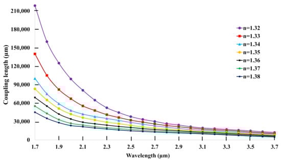 The coupling length ( in m) of the explored C-PCF for analytes 1.32 to 1.38 is shown in Figure 4. Following the inverse relationship, the coupling length decreases with the increase of wavelength. Additionally, the downward curve decreases very rapidly from 1.7 m to 2.4 m, but, after that, it decreases very slowly. At the same time, there exists another correlation among the analytes: a higher RI of analyte exhibits a shorter coupling length. This happened because of lower birefringence and higher loss peak response of lower analytes. The higher coupling length ensures long filling length, long filling time, and large volumes of analytes [39]. The explored C-PCF exhibits 60 mm and 30 mm coupling lengths at 1st and 2nd resonance points, respectively, for analyte n = 1.32.