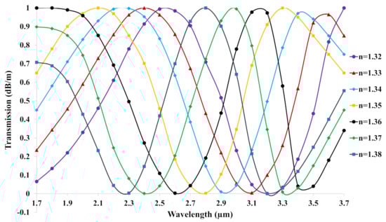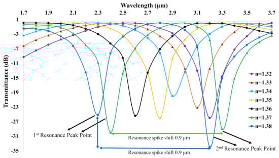 Here, T is the transmittance in dB, and and are the maximum output and input powers, respectively. The transmittance spectrum is shown in Figure 6 for RI = 1.32–1.38. The maximum transmittance of −34 dB is achieved for RI = 1.38. The other calculated transmittance profiles are −26 dB, −23 dB, −20 dB, −26 dB, −25 dB, and −30 dB for RI = 1.32–1.37, respectively. The higher RI of analyte had a denser curve than that of the lower RI analyte with a sharp downward peak. As a result, higher RI of analytes 1.38 and 1.37 exhibited two sharp downward peaks, respectively, while the rest exhibited one sharp downward peak. Moreover, the transmittance profile of analyte with n = 1.38 was the most lagged, while n = 1.32 was the most forward.