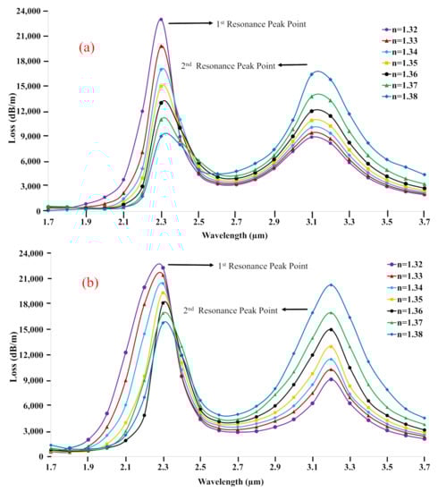 In Figure 7b, for Y polarization there exists the same relationship among the RI analytes like X polarization, which means the amplitude of the loss curve increases with the decrease of the RI analytes in the 1st peak, and the amplitude of the loss curve increases with the increase of the RI analytes in the 2nd peak. The sensitivity of 27,020.16, 27,049.15, 27,085.31, 27,128.00, 27,177.32, 27,226.43, and 27,237.45 nm/RIU were gained for RI analyte 1.32–1.38, respectively. Moreover, the measured resolutions were 3.70094 × , 3.69697 × , 3.69204 × , 3.68623 × , 3.67954 × , 3.6729 × , and 3.67142 × RIU, correspondingly.