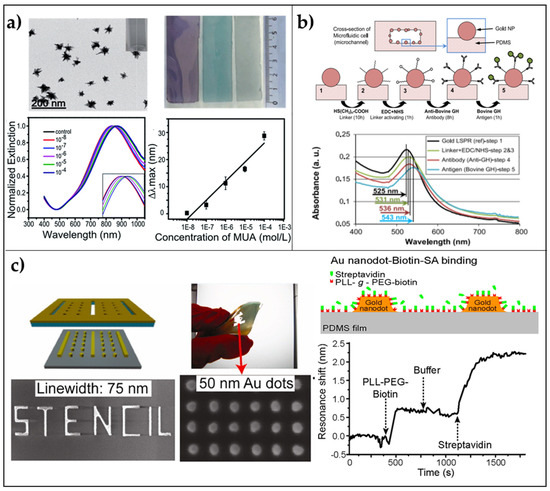 As a first example, we discuss the very simple fabrication of an LSPR platform based on the electrostatic self-assembly of gold nanostars (AuNSs) onto PDMS, reported by Shiohara and coworkers [71]. PDMS slabs were fabricated starting from the elastomer pre-polymer solution with its curing agent (elastomer and curing agent are used in a 10:1 w/w ratio) poured onto a glass slide. Heating at 60 °C overnight was required to cure the solution. The freshly prepared slab’s surface was modified with (3-Aminopropyl)triethoxysilane (APTES) at 40 °C for 4 h, and finally, soaked in AuNSs solution overnight. The authors tested the refractive index sensitivity of the sensor with three different populations of gold nanostars, and as expected, the highest sensitivity of 392.5 nm/RIU was achieved for nanostars having the longest tips (tip-shape effect) in the range 1.3334–1.4318. The sensing capability of this platform was assessed by measuring the LSP resonance shifts as a function of increasing mercaptoundecanoic acid (MUA) concentrations (from 10−8 M to 10−4 M), achieving a LOD of 10−7 M (Figure 2a). This very first result was very promising due to the very small size of the target molecule. Therefore, greater results in terms of shift and sensitivity could be achieved with bigger molecules such as antibodies.