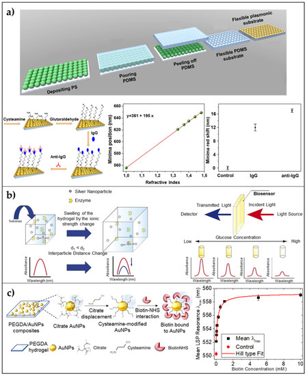 Plasmonic nanoparticles can be embedded within a hydrogel by sampling mixing a colloidal suspension of NPs with a pre-polymer solution in convenient volume ratios. For example, Randriantsilefisoa et al. [89], recently reported proof of concept showing the ability of polyol-based hydrogels to exhibit a strong colorimetric variation and shrinkage in the presence of a certain concentration of influenza A virus. Briefly, they start from a pre-polymer solution of dendritic polyglycerol cyclooctyne (dPG) with a molecular weight (MW) of 10 kDa, and diazide-poly(ethylene) glycol (PEG) with a total MW of 6 kDa. The two polymers tend to form a hydrogel using a strain-promoted alkyne–azide cycloaddition (SPAAC) reaction. The hydrogel was polymerized with sialic acid stabilized AuNPs showing high specificity and affinity with the hemagglutinin (HA) protein present in influenza A virus (IAV) in a multivalent manner. For such a reason, the detection of the virus was possible by simply looking at the colorimetric variation of the hydrogel. Analogously, a quantitative LSPR response from plasmonic nanoparticles embedded in a hydrogel matrix was reported by Endo ad coworkers [81]. They fabricated an LSPR enzyme biosensor using a nanocomposite of polyvinyl-pyrrolidone (PVP) hydrogel and silver nanoparticles functionalized with glucose oxidase enzyme (GOx). Due to the high affinity of GOx for glucose, upon the soaking of the platform in a glucose solution, a decrease in the absorbance spectrum of AgNPs was observed due to the swelling of the polymer proportional to the biomolecule concentration. This phenomenon was easily explained by the increase in the distance between NPs. The presence of the anionic reduced form of FAD in the reaction of GOx with glucose produced an enhancement in the swelling capability of the hydrogel, which strongly affected the scattered spectrum of the nanocomposite. The proposed sensor was able to detect glucose concentrations down to a LOD of 10 pM, showing great potential as a cost-effective and highly sensitive platform for medical applications (Figure 3b). More recently, Miranda et al., proposed the design and a large-scale, low-cost fabrication strategy of a poly(ethylene) glycol diacrylate (PEGDA) hydrogel embedding size-varying citrate AuNPs [17,90]. They show how the hydrogel physically retains spherical AuNPs within the mesh network allowing increased stability of AuNPs. A sensitivity of 110 nm/RIU in a range of refractive indices from 1.33 and 1.48 is reported together with a direct surface modification of AuNPs within the mesh network leading to the detection of Biotin down to a 25 μM concentration (Figure 3c).