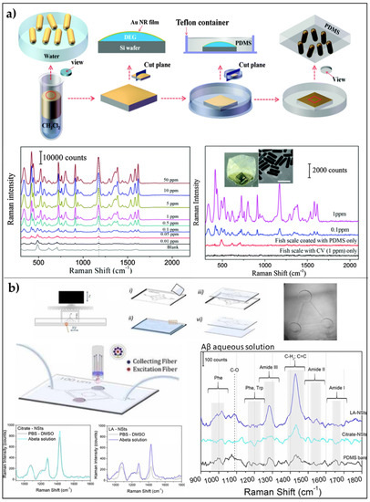 SERS platforms based on transparent polymers: (a) AuNRs/PDMS platform: schematic illustration of the preparation of AuNRs/PDMS substrate, SERS spectra of aqueous CV at various concentration, and SERS spectra of CV acquired by applying the nanocomposite film on the fish scale and then illuminating from the backside with a 785 nm laser. Adapted with permission from [101]. Copyright (2017) American Chemical Society. (b) AuNSs/PDMS microfluidic channel for SERS: Schematic illustration of the fabrication process of depicting the final device coupled with the Raman fiber probe; Raman spectra of aβ-42-peptide against buffer solution for Citrate-AuNSs substrates, and LA-AuNSs-PDMS; finally, a comparison of the background-subtracted Raman ‘fingerprint’ spectral region of aβ-42-peptide between bare PDMS, Citrate-AuNSs, LA-AuNSs substrates. Adapted with permission from [50]. Copyright (2020), IOP Publishing Ltd.