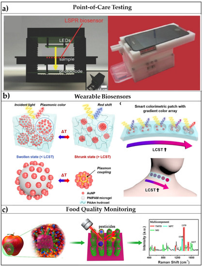 There is an increasing demand for portable biosensors, where the clinical diagnostics is directly transferred from equipped laboratories to the patient on site-diagnosis. This need asks for renovated fabrication strategies of point-of-care testing (POCT) devices, which show ease-of-use, compact size, and limited costs [118,119]. Many examples of already commercialized POCT have been reviewed recently and include pregnancy tests, glucose testing, and HIV testing [120]. LSPR- and SERS-based flexible biosensors are promising transducers for the design of a POCT due to the ease of integration with microelectronics and microfluidics [121] (Figure 6a).