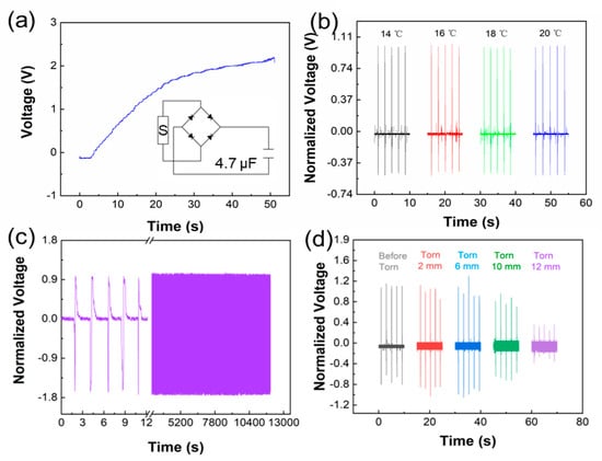 (a) Charging a 4.7 μf capacitor through a rectifying bridge; (b) output piezoelectric voltage of sensor at different temperatures; (c) durability of the sensor for 3.5 h; (d) the output piezoelectric voltage after cutting the sensor.
