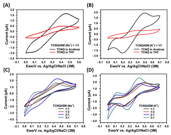 Cyclic voltammograms for TCNQ solvent selection and TCNQ/ISM volume ratio optimization: (A,B) cyclic voltammograms for Na+ (140 mM NaCl) and K+ (5 mM KCl) detections, respectively; (C,D) cyclic voltammograms for Na+ and K+ detections with different TCNQ/ISM volume ratios, respectively.