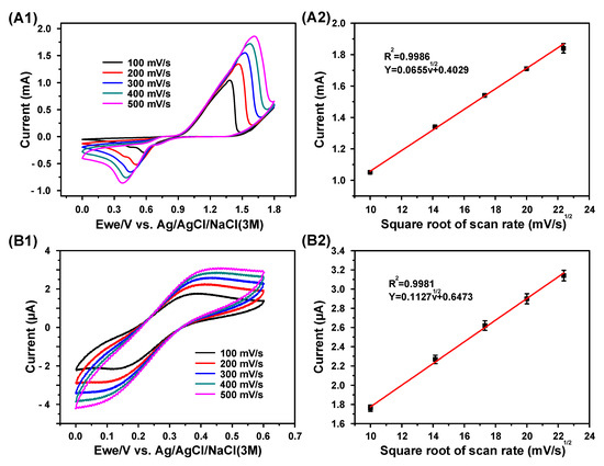Figure 4 shows the CV results of the proposed different electrodes at scan rates ranging from 100 to 500 mV/s in 50 mM KCl, 140 mM NaCl, and 1 mM KCl solutions. The cyclic voltammograms displayed in Figure 4(A1–C1) show that the absolute value of the oxidation and reduction peak currents increased with the increase in scan rate. Generally, the Randles–Sevcik equation (Equation (1) is used to evaluate the diffusion-controlled characteristic of a sensing electrode.