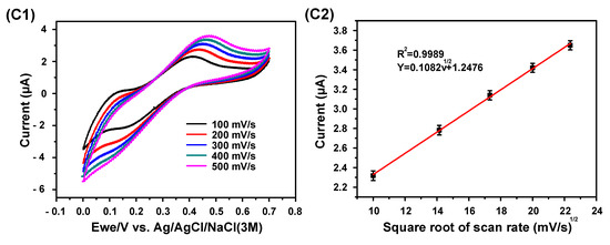 where ip is the peak current, n is the number of electrons appearing in a half-reaction for the redox couple, A is the electrode area (cm2), C is the analyte concentration (mole/cm3), D is the analyte diffusivity (cm2/s), and v is the scan rate of potential (V/s). For stationary n, A, C, and D, ip is a linear function of the square root of the scanning rate. The corresponding linear relationship between the peak current and the square root of the scanning rate of the proposed electrodes for the cyclic voltammograms shown in Figure 4A1–C1 are given in Figure 4A2–C2, respectively. The R2 values were calculated to be 0.9986, 0.9981, and 0.9989, respectively. The results demonstrate that the proposed electrodes possess a typical diffusion-controlled electrochemical characteristic; hence, the electrodes are suitable for practical quantitative analyses.