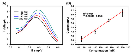 Na+ detection using square-wave voltammetry (SWV): (A) cyclic voltammograms (100 mV/s) for various Na+ concentrations (50–200 mM); (B) linear calibration curve representing the relation between the stable oxidization peak current and concentration; scanning range: 0–0.5 V, pulse height 100 mV, pulse width 200 ms, step height 20 mV, N = 3.