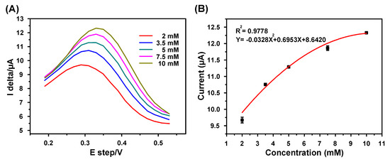 The SWV detection results of K+ with various concentrations (2, 3.5, 5, 7.5, and 10 mM) are shown in Figure 7. In Figure 7A, the oxidation current peaks increase with increasing K+ concentrations. Figure 7B shows the corresponding quadratic calibration curve for K+ detection, which is more appropriate for fitting the measured data. The detection range, sensitivity, correlation coefficient, RSD, and recovery rate of the electrode were measured to be 2–10 mM, 0.56–7.98 μA·mM−1 cm−2, 0.9778, 0.47%, and 96%, respectively.