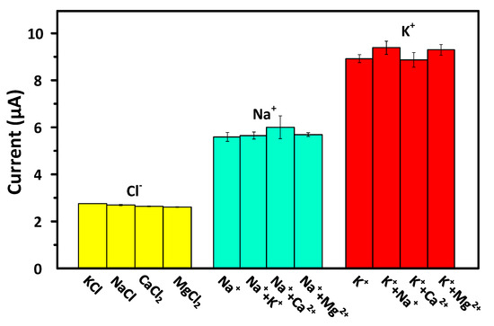 As shown in Figure 8, the current response of the K+ detection electrode in pure KCl solution was measured to be 8.92 µA. The current interferences after the addition of NaCl, CaCl2, and MgCl2 were measured to be 5.23%, 1.01%, and 4.21%, respectively. Similar to the results of the interference experiment of the Na+ detection electrode, there was no statistically significant difference between the current response of the KCl solution containing any of the three interference substances and that of the pure KCl solution. The experimental results show that the proposed K+ detection electrode possesses good selectivity.