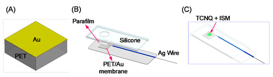 Fabrication process of the chloride, potassium, and sodium ions detection electrodes: (A) sputtering of Au thin-film on a polyethylene terephthalate (PET) membrane; (B) packaging; (C) dropping of 7,7,8,8-tetracyanoquinodimethane (TCNQ) + ion-selective membrane (ISM) mixture solution (potassium and sodium ions detection electrodes).