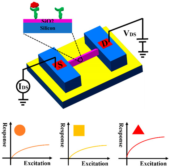 The increasing demand for the detection of biological and chemical molecules, such as tumor markers [1,2,3] and volatile organic compounds (VOCs) [4], has become imperative in the past several years. Ultrahigh sensitivity is essential for the detection of these targets. Currently, thin film sensors and nanosensors are widely adopted for this mission because of their advantages in sensitivity [5,6,7]. Among these sensors, SiNWs-FET sensors have received increasing attention as they have ultrahigh sensitivity, which is necessary for the detection of these samples [8,9,10,11]. There are many factors, such as debye length [12], surface binding sites [13] and molecular affinities [14], that affect the sensitivity of SiNWs-FET sensors. Larger debye length, more surface binding sites and stronger molecular affinities lead to better sensitivity.