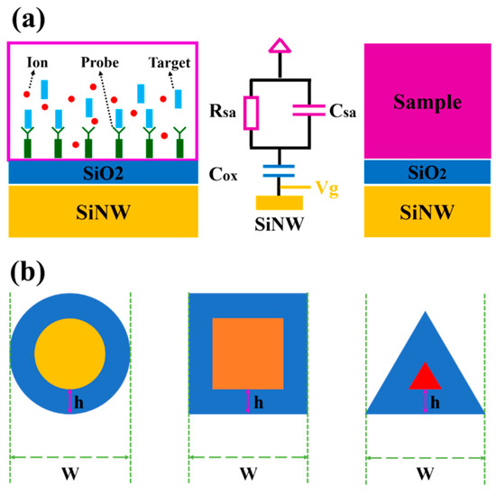 (a) The schematic of the sensitive mechanism during the process of target detection and the equivalent circuit model for SiNWs-FET sensors. (b) Cross-section view of the depleted area of the three types of silicon nanowire with the same depletion depth h.