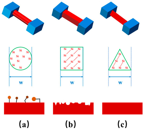 Three types of SiNWs-FET sensors and diagrammatic sketch of surface states and lattice quality with their cross-sections being (a) circle, (b) square, (c) triangle, respectively under the same feature size W.