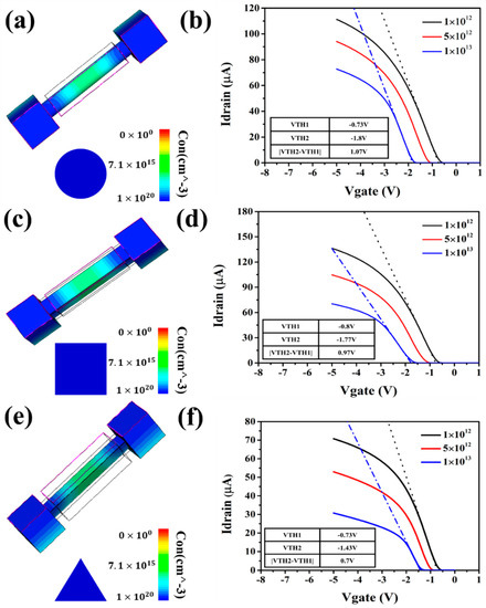 Next, we used Sentaurus TCAD to simulate these three types cross-sectional SiNWs-FET sensors to verify our theoretical derivation. Charged target binding to a SiNWs-FET sensor will change its own threshold voltage. In Equation (2), the charge density Qs can be calculated by: . Therefore, the offset of the threshold voltage, obtained from the result of the simulation, can be used to support our theoretical analysis. We created three models of SiNWs-FET sensors with different cross-sections in Sentaurus TCAD, and set the lattice quality and the density of the interface state in turn. The value of the charge density was 1 × 1012, then 5 × 1012, and finally 1 × 1013, with the results of the simulation being recorded. The simulation results of SiNWs sensors with circular, square and triangular cross-sections are shown in Figure 4a,c,e, and the results of corresponding threshold voltage offset are shown in Figure 4b,d,f.