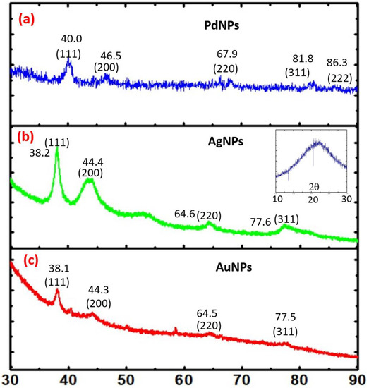These findings confirm that the organotrialkoxysilane efficiently allows the controlled reduction of noble metal cations into nanoparticles in a variety of configurations to yield noble metal nanoparticles and multimetallic nanoparticles. These nanoparticles have been further characterized by XRD analysis. Figure 2 shows the XRD analysis of PdNP (Figure 2a), AgNP (Figure 2b) and AuNP (Figure 2c) nanoparticles, respectively. Similarly, the XRD results from Au-Ag-Pd, Ag-Au, Ag-Pd, Au-Pd nanoparticles are shown in Figure 3a–d, respectively. The corresponding planes as evaluated from diffraction patterns confirm the role of the trialkoxysilane in the controlled processing of noble metal nanoparticles and multimetallic nanoparticles.