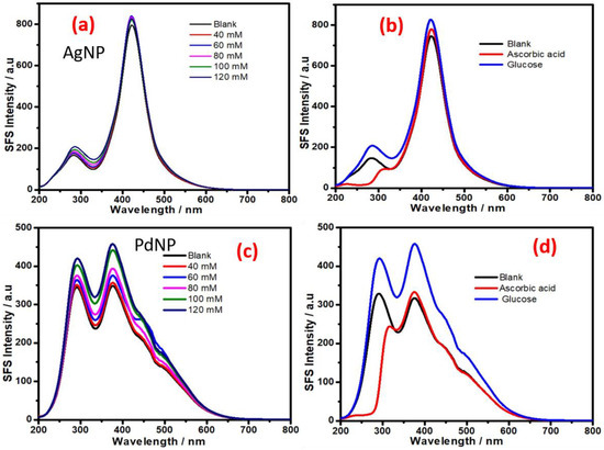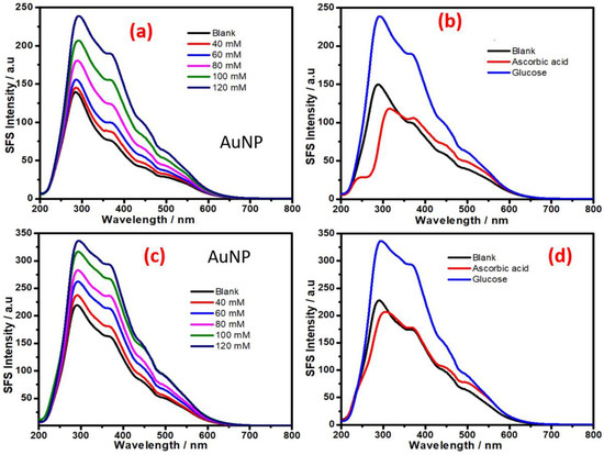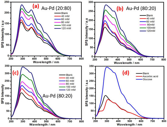 We also investigated the role of other monometallic, bimetallic and trimetallic nanoparticles (e.g., Ag NPs, Pd NPs, Ag-Au NPs, and Ag-Au-Pd NPs) to understand their SFS signal as a function of the glucose concentration. The results recorded in Figure 7 indicate the dependence of the SFS signal on the glucose concentration with AgNPs (Figure 7a) and PdNPs (Figure 7c), respectively. Additionally, the results in the presence of ascorbic acid have been shown in Figure 7b,d, respectively. These results indicate that AgNPs are the least sensitive in terms of the SFS signal produced as a function of the glucose concentration; PdNPs were noted to show better sensitivity than AgNPs (Figure 7). Furthermore, the presence of gold and silver as Ag-Au bimetallic NPs also significantly reduces the sensitivity of the SFS signal as a function of the glucose concentration (Figure 8); this result suggests the presence of silver was associated with a decrease in SFS signal as a function of the glucose concentration.