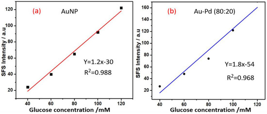 Linear plot (a) Concentration of glucose versus synchronous fluorescence spectroscopy (SFS) intensity in the presence of AuNPs with Nafion. (b) The concentration of glucose versus SFS intensity in the presence of bimetallic Au-Pd nanoparticles with an Au:Pd ratio of 80:20 with Nafion.