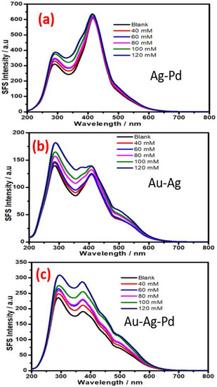 The variation of the SFS signal from Ag-Pd, Ag-Au, and Au-Ag-Pd NPs as a function of the glucose concentration is shown in Figure 8. Figure 8a–c indicate that the bimetallic and trimetallic NPs that contain Ag as one of constituents are not potentially active for non-enzymatic glucose sensing based on synchronous fluorescence spectroscopy (Figure 8); this result confirm the finding related to the role AgNP as recorded in Figure 7a.