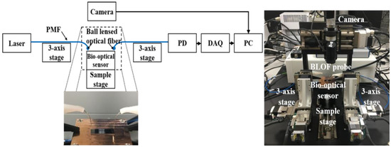 The schematic design and image of our BLOF-based bio-optical signal measurement system is shown in Figure 1. The basic configuration of this system comprises an illumination part with a swept source laser as the optical source (Model TSL-550; Santec, Komaki, Japan) and a detection part with a photodiode as the optical signal acquisition device. The central wavelength of the swept source laser is 1550 nm and its scan range is 50 nm. The workflow of the device is as follows: a swept laser beam with a 10 pm sweeping step passes through a BLOF and enters the single chamber of the bio-optical sensor on the sample stage. The bio-optical sensor then amplifies and detects the target DNA at a given laser wavelength. The optical signal related to the target DNA is then gathered into a BLOF connected to a photodiode (Model C10439-8271; Hamamatsu Photonics, Shizuoka, Japan), which detects the signal. A data acquisition system (DAQ, National Instrument, Seoul, Korea) was used for the signal processing and automatic system control in a personal computer. Two 3-axis motor-controlled stages were used to automatically manipulate the position of the BLOF toward the bio-optical sensor. A polarization-maintaining optical fiber (PMF) was used to manufacture the BLOF.