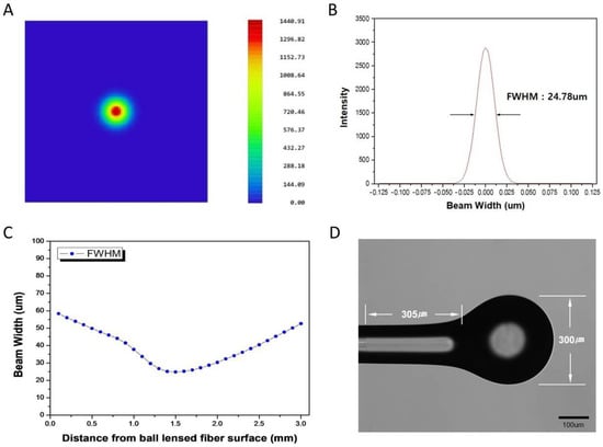 Information on the ball-lensed optical fiber (BLOF). (A) Intensity profile of a beam at the focal plane (z = 1.5 mm). (B) Intensity line profile along the horizontal arrow. (C) Beam widths according to the distances of the laser beam emitted from the BLOF. (D) Manufactured BLOF using a fusion splicing machine.