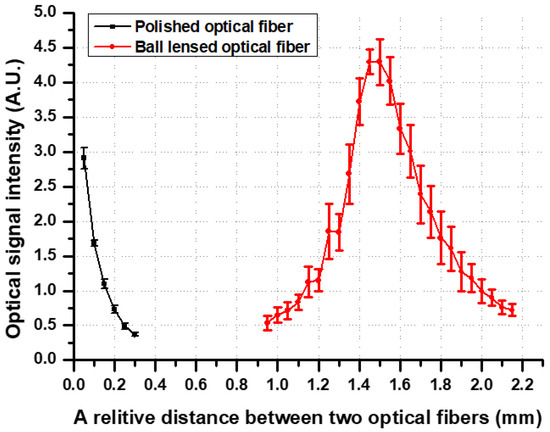 To eliminate the irregular refraction of a beam due to a rough optical fiber surface, an optical fiber with its end evenly polished was also tested using this proposed system (Figure 1) for comparison with the BLOF. Figure 5 shows the results of the optical signal intensities detected using the BLOF and the polished optical fiber, where the x axis represents the relative distances for the OSSP with the BLOF and the OSSP with the polished optical fiber. First, while monitoring the maximum value of the optical signal, we moved the polished optical fiber closer to the bio-optical sensor to excite the laser beam into the sensor input channel. The distance between the polished optical fiber and the input sensor was approximately 0.05 mm for the maximum optical signal intensity. We moved the polished optical fiber from the point of maximum intensity to 0.3 mm with a step size of 0.05 mm. The intensity decreased significantly when the distance was 0.1 mm away from the starting point. On the other hand, the maximum signal intensity of the BLOF was measured at approximately 1.5 mm from the starting intensity point of the polished optical fiber, which meant that the BLOF functioned as a lens with a focal length of approximately 1.5 mm. We moved the BLOF from 0.95 mm to 2.15 mm with a step size of 0.050 mm. From these results, it was found that the optical sensing range covered by the BLOF was 1.2-fold wider than that of the polished optical fiber, and the detected intensity at the maximum intensity point was approximately 1.5-fold higher. These results demonstrate the improved stability and sensitivity of the new BLOF-based OSSP proposed in Figure 1, given the method provided the system with the capability to cover a larger range of measurements with a higher signal intensity. Our findings are of great importance in terms of the clinical application of the system for the rapid diagnosis of infectious pathogens [20,21,22,23,24]. In our previous system, the optical fiber could easily come into contact with the bio-optical sensor, even with only small external impact, because the distance between the two components was less than 0.1 mm, which caused misalignment of the measurement angle by 8° and damage to the sensing part of the system, such as fractures. By contrast, the new system obviates contact problems, as the distance between the BLOF and the sensor is much wider. Therefore, the BLOF based bio-optical sensing system provides automatic operation, measurement and analysis for the detection of pathogens.