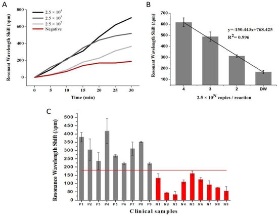 To optimize and validate our new BLOF-based bio-optical sensor for clinical applications, we used it to measure the quantitative wavelength shifts under C. burnetii DNA-positive and -negative conditions and to analyze clinical samples from nine patients with Q fever and nine patients with other febrile diseases (Figure 6 and Figure S1). The forward and reverse primers for the BLOF-based bio-optical sensor were synthesized at the usual length of approximately 34 bp (Table S1). To compare the differences in wavelength shifts of the amplified C. burnetii DNA, we measured the quantitative wavelength shifts under DNA-positive (using different DNA concentrations; i.e., 2.5 × 104, 2.5 × 103 and 2.5 × 102 copies/reaction) and DNA-negative conditions every 5 min for 30 min. Figure 6A shows the temporal changes in the resonant wavelength shifts (∆pm) for a given concentration of DNA copies/reaction and under negative conditions, where a vertical value represents the resonant wavelength shift (in pm) and a horizontal value represents the time. It was confirmed that the amount of wavelength shifts increased overall with increasing DNA concentration and time. The wavelength shift of C. burnetii DNA as the positive control was higher than that of distilled water as the negative control. Next, the linear relationship between the wavelength shift and the target concentration over 25 min was obtained (Figure 6B). From these results, we confirmed that the results obtained with the proposed system agreed well with those obtained with the previous system described [23,24]. Moreover, the proposed system would be able to recognize subtle changes in the pathogen concentration from earlier stages of the disease within 20 min, as reported in our previous studies [20,21,22,23,24]. In this respect, we expect that the proposed method will provide the rapid diagnosis of infectious pathogens with high sensitivity and stability.