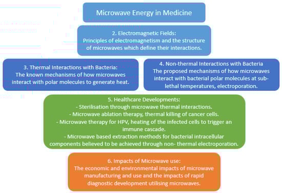 Microwaves are a section of the electromagnetic (EM) spectrum (Figure 1; [1]): this spectrum ranges from radio waves to gamma rays. The EM spectrum can be expressed as frequency, which is measured in Hertz, wavelength and energy. Shorter waves with a higher value of energy such as ultraviolet are classed as ionizing as they generate sufficient energy to produce ions at a molecular level, causing damage to DNA and proteins. Whilst longer waves such as visible light are classified as non-ionizing; these can still cause thermal damage, however, this damage is not caused through ions. Microwaves are a type of electromagnetic radiation with free-space wavelengths ranging from 1 metre to 1 millimetre, with the frequency ranging between 300 MHz and 300 GHz, respectively [2]. The most common microwave frequency used is centred at approximately 2.45 GHz, which lies within the Industrial Scientific and Medical (ISM) radio band and is reserved for such purposes [3]. In recent years, microwave energy has been successfully exploited within medicine to treat diseases such as cancer and microbial infections via ablation therapy. There is now increased interest in using a range of microwave frequencies other than 2.45 GHz in the treatment of diseases; however, there is still limited understanding of the mechanisms of action of microwaves that induce biological changes in organisms. In this review, we focus primarily on microwave interactions at a cellular level with bacteria as model organisms. Herein we examine current literature regarding the functionality, current and prospective uses of microwave energy across a range of frequencies to demonstrate state of the art microwave advances in the medical industry (Figure 2) [4,5].