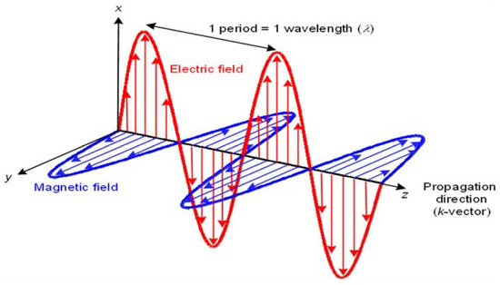 Both magnetic and electric fields are bound by laws of attraction which state that opposite charges always attract while ‘like’ charges repel. The strength of the attraction or repulsion is negatively proportional to the distance of the charges. One of the best examples of these laws is the chemical bonding between atoms via charged electrons and protons, these interactions can be described mathematically with Coulomb’s law [7]. Magnetic fields are produced by the presence of two charges that create field lines, where these lines intersect is described as poles, an example of this is the Earth’s North and South pole, and such magnetic charges can only exist as dipoles, not monopoles. Mathematical equations such as Maxwell’s equations prove the model for electromagnetism, furthermore, these equations describe how fluctuating electric and magnetic fields (Figure 3) travel at a constant speed [8]. Electromagnetic fields can act as waves and particles simultaneously; the waves travel outwards from their source and can move through a medium or a vacuum. In a vacuum, the wave travels at the speed of light, similarly, the air in our atmosphere is thin enough not to affect the propagation of the wave, however, when travelling through media the refractory index of the media will affect the movement of the waves. For media such as water, other factors alter the propagation; the high permittivity and electrical conductivity of water greatly increase the angle of refraction [9,10]. Another factor to consider is the microwaves ability to interact with polar molecules; water molecules are polar and so as the microwave passes through the water as a medium it also interacts with it. Polar molecules rotate when exposed to microwaves as they attempt to align with the waves’ fluctuating charges; the rotation produces heat and is the basis of microwave heating [11].