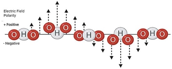 Microwaves are commonly used to heat food whilst reduce the microorganisms found within. Microwave heating reduces the number of microorganisms within food via direct thermal killing of cellular targets that render the bacteria either dead or inactive and therefore unable to replicate [13]. The microwave heating process relies on the interaction between polar molecules and the microwaves; in a 2.45 GHz microwave oven, the microwave frequency is strong enough to cause water molecules in the food to rotate at a speed that generates heat to cook food safely (Figure 4) [14].