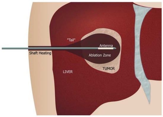 Ablation therapy is a state of the art treatment and destructive tool for abnormal tissues via heating by radio waves or microwaves [38]. Microwave ablation is a method of thermal tumour ablation where tumours are heated to damage the structure and proteins of the cell. As tumours have a higher water content than healthy tissues, the microwaves induce rapid heating via interacting with the polar water molecules within the tumour cells. Due to the microwaves ability to propagate through media, they can pass through and heat various tissues making it an applicable thermal ablation therapy for a variety of tissues [4,5,39,40]. Microwave ablation therapy for hepatocellular carcinoma is being viewed as a potential first line treatment for tumours on the liver surface, in which the tumour is exposed to a 2.45 GHz microwave with a wattage of 80–100 (Figure 5) [5,41]. Microwave ablation therapy has not only been successful within the liver, clinical studies have also shown complete ablation of tumours within the kidneys, lungs and bone; indeed, the majority of studies have resulted in no recurrent tumours [42]. Despite the success of microwave ablation, the use of this treatment is not as widely practised as expected, this is partly due to the expertise and equipment needed to perform the therapy, alongside competing for ablation therapies, such as radiofrequency ablation therapy [43,44,45]. Radiofrequency ablation yields similar successful tumour ablation results, however, there are advantages to microwave ablation, microwaves produce higher temperatures with shorter ablation times and a smaller heat sink effect [46,47]. Ablation therapy is a key development in the treatment of tumours, allowing their destruction without the need for surgery; the increased usage of both ablation techniques could reduce the cost and time needed to treat small tumours [48,49].