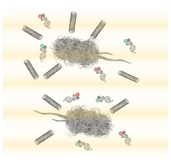 Diagnostic and identification methods that do not rely on the extraction of intracellular components have also been researched. Nanotube assisted microwave electroporation (NAME) is a method that utilises electroporation; NAME however aims for visual identification rather than DNA extraction [70]. This technique can be applied to not only extract the contents of a bacterial cell but to act as a transport system to deliver molecules such as biosensors into the cells (Figure 6). In this method, carbon nanotubes are used as an antenna for coupling microwave energy; this localizes the electromagnetic field that induces bacterial electroporation in the cellular wall to the areas around the nanotube. This enhanced electroporation to specific areas (caused by the nanotubes) allows for the delivery of intracellular probes that consist of double stranded nucleic acid-targeting specific bacterial 16S rRNA and fluorophores, enabling the identification of Escherichia coli, Klebsiella pneumoniae and Pseudomonas aeruginosa for example at the single-cell level. An individualized probe was designed for each bacterial species. Bacterial samples of E. coli, K. pneumoniae and P. aeruginosa, after appropriate washing steps and the addition of the nanotube solution, were exposed to a 2.45 GHz microwave for 10 s, enabling electroporation and probe delivery. Once the probe was delivered into the bacterial cell via NAME the samples were mounted onto glass slides for observation under a fluorescent microscope; fluorescent cells were accurately identified. This delivery and identification method can be used directly on samples, and the whole process from the initial sample to microscopic identification can take as little as 30 min. NAME can identify pathogens such as those mentioned previously at a single cell level enabling accurate quantification via cell counts of fluorescent cells under the microscope, however further instrument development is required before this method can be clinically evaluated [71,72].