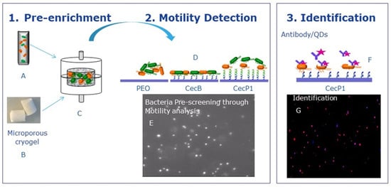 The results show that P(HEMA-AEM) microporous cryogel is a material of choice to enrich bacteria concentration from different samples and matrices. The time needed for the pre-enrichment is controlled by optimizing the mass of the cryogel and the flow-rate to the volume of sample to be analyzed. Captured bacteria are then eluted from the cryogel straightforwardly to detect them on a chip by DF microscopy and image analysis. As proof of concept, this study shows that motility monitoring, i.e., affinity towards a small set of AMPs, allows us to differentiate bacteria families by looking at Escherichia coli and Bacillus sp. as models for Gram-negative and Gram-positive bacteria, respectively. The screening potential of our system can be improved by analyzing bacterial motility patterns by using a larger set of AMPs with complementary affinity [15].