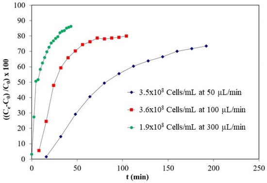Breakthrough curves of E. coli bacteria in PBS at similar inlet concentrations and temperatures but different flow rates at 50, 100, and 300 µL min−1. The mass of the cryogel was 30 mg.