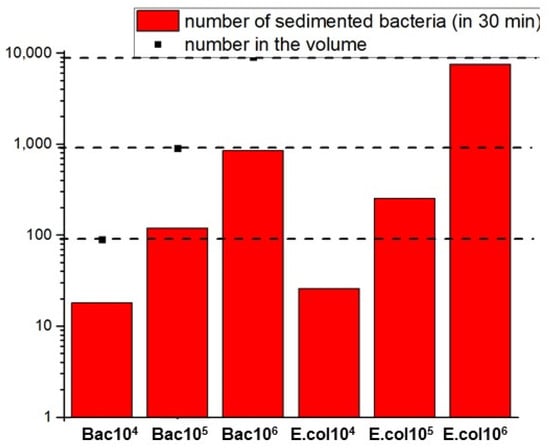Figure 3 presents the number of settled bacteria during the motility analysis as a function of the initial concentration and the number of bacteria contained in the channel volume. For a field of view of 0.16 mm2, concentration of 104 cells mL−1 and a settlement time of 30 min, around 20 bacteria among the initial 300 bacteria present in the volume reached the surface. As reference, 5 bacteria has been indicated as a sufficient number to make a reliable quantitative detection [26].