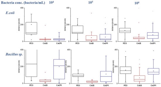 In addition, Bacillus sp. showed high-affinity with CecB, as a result of a reduction in the average travelled distance of about 80% while showing a lower affinity with CecP1 since the travelled distance was very similar to the one measured on PEO (motility reduction lower than 15%). The obtained results are in agreement with the literature [27] and show that CecB AMPs have a high-affinity for both Gram (+) and Gram (−) bacteria, while the CecP1 only shows a high-affinity for the Gram (−) bacteria.