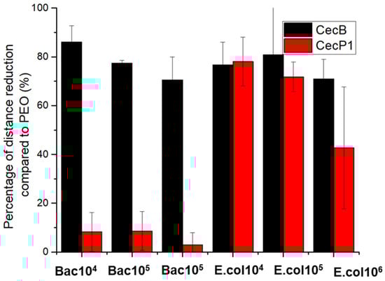 Both CecB and CecP1 induced a large reduction in the E. coli motility for all concentrations. The average distance travelled by E. coli was reduced by about 80% and 60% for CecB and CecP1, respectively, to those measured on bare PEO. This motility reduction showed that both AMPs interact strongly with the E. coli bacteria membranes that have a slightly higher affinity for the CecB.