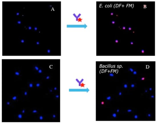 In addition, bacteria immobilized on the AMPs can be specifically recognized by incubating the immobilized bacteria with the specific fluorescently labelled antibodies (e.g., Anti-E. coli-QDs complexes). Then, superimposition of DF and FM images enables us to distinguish between bacteria recognized by antibodies and bacteria not recognized, i.e., to determine whether other families of bacteria are present in the sample but are not recognized by the specific antibodies. Further miniaturization using a smartphone-like device of DF microscopy could also be implemented for fast and in the field measurements [28,29]. The ability of the biosensor to detect targeted pathogens in low concentrations among several other bacterial species and cells needs to be further addressed.
