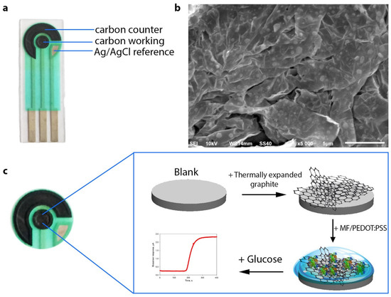 (a) Schematic of a graphite screen-printed electrode featuring counter, reference and working electrodes. (b) SEM image of thermally expanded graphite. (c) Schematic of the formation of a composite on the surface of the biosensor’s working electrode and its operating principle.