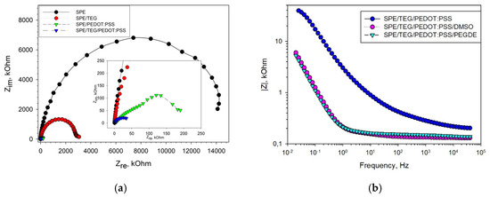 EIS Nyquist plots recorded in the presence of a 5 mM [Fe(CN)6]3−/4− redox couple prepared in a 25 mM phosphate buffer with 0.01 M NaCl at an open-circuit potential (+200 mV vs. Ag/AgCl). (a) Change in impedance due to the presence of TEG, PEDOT:PSS and TEG/PEDOT:PSS on SPE; (b) change in the impedance profile due to a modification of PEDOT:PSS with DMSO and PEGDE.