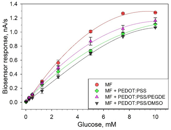 Comparing the metrological characteristics of the developed systems and their analogues, it can be seen that the lower limits of the linear ranges of detection for all three composites are approximately the same. The amplitude of the signal upon addition of glucose and the maximum achievable current (Imax) increase when using modified variants of composites. Moreover, the biosensor sensitivity coefficient at an additional modification of PEDOT:PSS with DMSO or PEGDE increased from 0.46 up to 0.8 or 0.82 μA/mM. The apparent Michaelis constant (Km), which is the substrate concentration needed to achieve half of the Imax value, increases in the sequence TEG/PEDOT:PSS > TEG/PEDOT:PSS/DMSO > TEG/PEDOT:PSS/PEGDE. The Hill coefficient (h) is a dimensionless value that characterizes the cooperativity of ligand binding by the enzyme. As seen from the data obtained, in all cases, the Hill coefficient is greater than 1, i.e., a positive cooperativity of the enzymes is observed for MFs immobilized in all types of PEDOT:PSS polymers. It should also be noted that the single measurement time decreased to 2 min when using a TEG/PEDOT:PSS/PEGDE composite, which is due to a decrease of electrode impedance and an increase of electron transfer rate in the system.