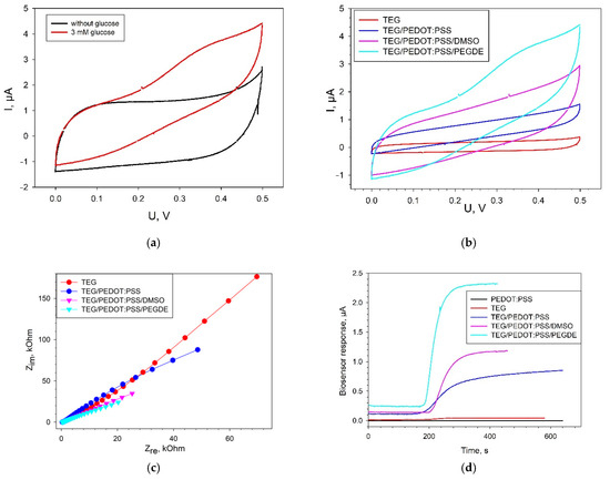 Figure 4b presents the cyclic voltammograms for four types of bioelectrodes in the presence of 3 mM glucose. All reported CVA curves for electrodes containing PEDOT:PSS (Figure 4b) were of rectangular shape, which is typical of PEDOT in an aqueous medium and is indicative of a capacitive behavior of these materials. The maximal level of anodic currents within the range of 0 up to 0.5 V was obtained for the bioelectrode with a TEG/PEDOT:PSS/PEGDE composite.