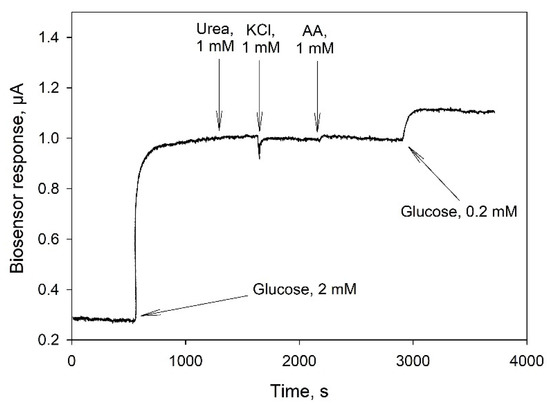 In biosensor applications, a key concern is the fact that the selectivity of a glucose sensing device can be decreased by interference from some coexisting substances in real samples. As membrane fractions of bacteria contain a whole range of enzyme complexes, it was necessary to understand which substances could hinder the accurate determination of glucose in real blood samples. Figure 6 presents an amperometric signal of a biosensor based on TEG/PEDOT:PSS/PEGDE in response to some potential interferents including urea, ascorbic acid (AA) and KCl in an oxygen-containing PBS solution (0.1 M, pH 6.5) under an operating potential of 0.4 V. None of the above interferents evoked any notable response from the biosensor for 1500 s after their introduction, while the addition of 2 mM glucose caused a significant increase (0.7 µA) of the current level within 100 s. Thus, the membrane fraction/TEG/PEDOT:PSS/PEGDE electrode exhibited a good selectivity towards glucose over these molecules that can be found in the human blood.