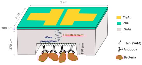 The geometry of the biosensor is shown in Figure 1. It consists of a 4 mm × 4 mm GaAs (100) membrane whose top surface is coated with a 700-nm thick film of piezoelectric ZnO. A pair of electrodes (Cr/Au, 20/200 nm) deposited on the ZnO film allows the generation of bulk acoustic waves in thickness shear mode, excited by lateral field and propagating in GaAs. The bottom surface of the membrane is biofunctionalized with alkanethiol self-assembled monolayers (SAM) and antibodies against E. coli. The chosen design has the advantage of separating the electrical interface from the biological fluid, which prevents the attenuation of the electric signal due to the potential contact with the liquid, and ensures frequency stability.