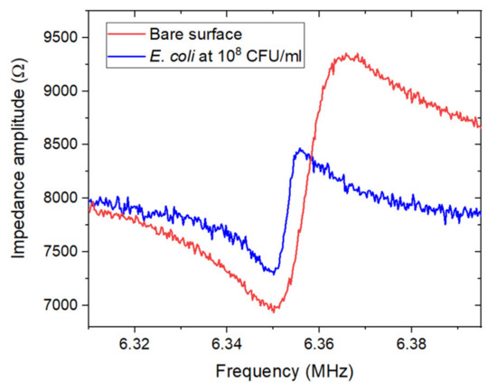 Example of the impedance amplitude measured near the resonant frequency (fr = 6.35 MHz) for ZnO/GaAs membrane (220 μm) before and after exposure for 1 h to E. coli suspension at 108 CFU/mL in PBS 1X.